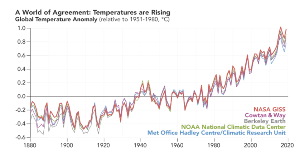 Matjet e besueshme të temperaturës globale kanë nisur rreth viteve 1880 pasi më herët një pjesë e konsiderueshme e planetit nuk mbulohej nga aparaturat matëse. Regjistrimet e temperaturës globale filluan rreth vitit 1880, sepse vëzhgimet nuk e mbulonin mjaftueshëm planetin përpara asaj kohe. Grafiku i mësipërm pasqyron ndryshimet vjetore të temperaturës mesatare nga viti 1880 deri në vitin 2020, bazuar në matjet e NASA-s, NOAA-s, grupit kërkimor Berkeley Earth, Qendrës Met Office Hadley (Mbretëri e Bashkuar), dhe Modelit Cowtan dhe Way. Megjithëse ka ndryshime të vogla nga viti në vit, të pesta burimet janë të sinkronizuara për sa i përket uljeve dhe ngritjeve të temperaturave. Të gjitha analizat flasin për përshpejtim të ngrohjes në këto dekada dhe në gjetjet e tyre, dekada e fundit rezulton të jetë më e nxehta.