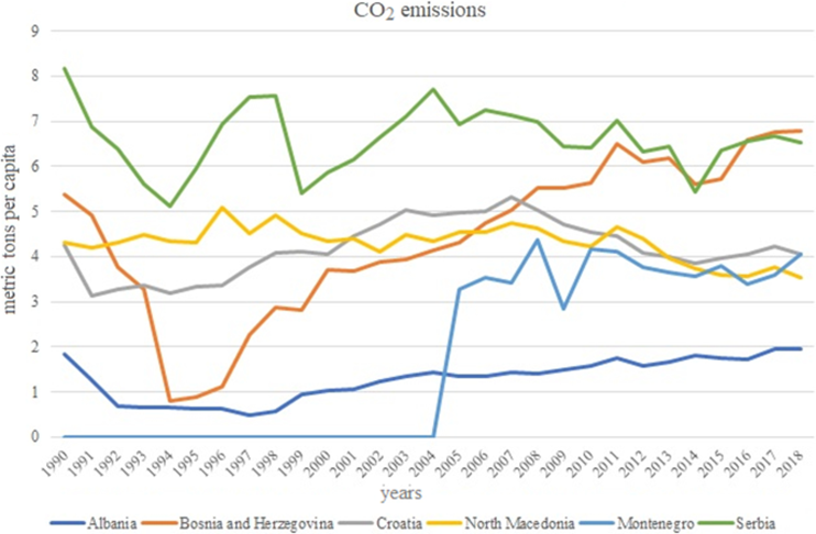 Nga viti 1990 deri në vitin 2018, shkarkimet e CO2 për Ballkanin Perëndimor variojnë nga 1-8 tonë për person (Fig.1). Këto vlera janë më shumë se gjysma e shkarkimeve nga vendet e BE-së dhe më shumë se çereku i shkarkimeve të Shteteve të Bashkuara (Fig. 2).