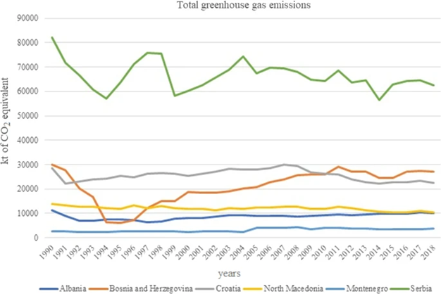 Nga viti 1990 deri në vitin 2018, shkarkimet totale të gazeve serë (kt e ekuivalentit të CO2) për Ballkanin Perëndimor janë paraqitur në Fig. 3.