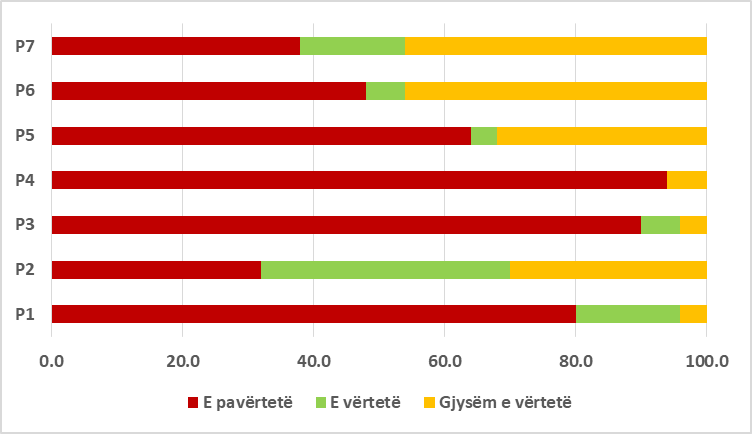 Si vihet re, për Pohimin 1 (Ndryshimet klimatike nuk po ndodhin) 80% e studentetëve e cilësojnë të pavërtetë dhe vetëm 16% e tyre e cilësojnë të vërtetë. Gjithashtu, në mënyrë dërrmuese, të pavërtetë cilësohen Pohimi 3 (Gazet serё si pasojё e aktivitetit njerёzor nuk janё pёrgjegjёse pёr ngrohjen globale) dhe Pohimi 4 (Pasojat e ngrohjes globale nuk rrezikojnё Jetёn nё Tokё) me përkatësisht, 90% dhe 94%.