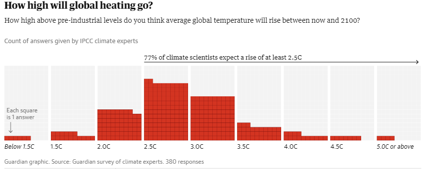 “The Guardian” ka kontaktuar të gjithë autorët potencialë të Panelit Ndërqeveritar për Ndryshimet Klimatike (IPCC), i cili është autoriteti më i lartë akademiko-kërkimor global për të trajtuar sfidat e ndryshimeve klimatike. Rreth gjysma e tyre kanë reaguar në pyetësor, dhe sipas rezultateve të mbledhura, shumica e tyre u përgjigjën se presin ngjarje të rënda klimatike në dekadat pasuese. Kjo pritje bazohet në faktin se vlerat e temperaturës, me gjasë, do ta tejkalojnë normën e 2.5°C pavarësisht të gjitha masave të ndërmarra.