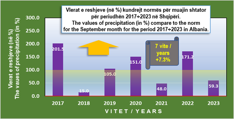Në përgjithësi, muaji shtator është karakterizuar nga luhatjet më të mëdha të regjimit të resheve gjatë këtyre viteve të fundit. Kjo dukuri dallohet qartë në grafikun që tregon vlerat e reshjeve, të shprehura në përqindje përkundrejt normës, për matjet e kryera në shkallë vendi gjatë shtatë viteve të fundit. Siç paraqitet në figurën e mëposhtme, mesatarisht shënohet një vlerë prej 7.2% mbi normën.