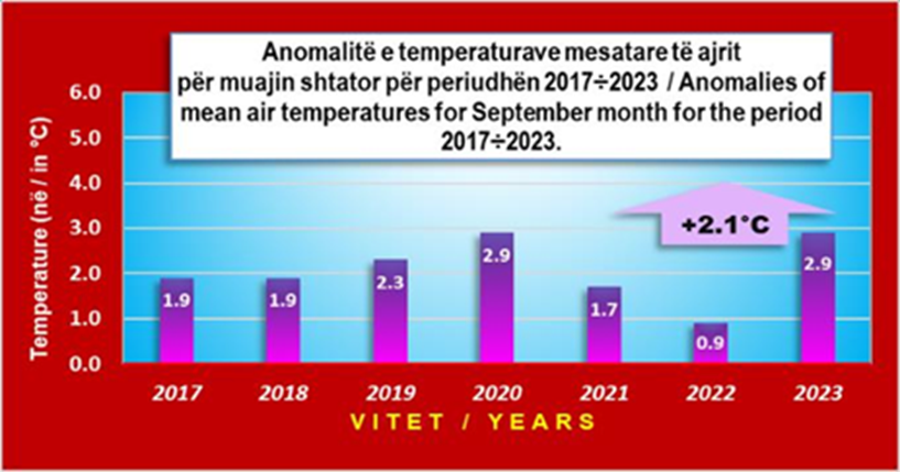Ndërkohë, temperaturat e ajrit kanë ruajtur në mënyrë pothuajse të qëndrueshme vlera mbi normën. Anomalitë e tyre për shtatë vitet e fundit, referuar vlerave mesatare, maksimale dhe minimale, kanë qenë vazhdimisht pozitive. Shtatori i këtij viti ka ndjekur prirjen e muajve të tjerë të 2024, duke shënuar temperatura më të larta se normalja. Veçanërisht gjatë javës së parë, temperaturat kanë qenë 1 deri në 7 gradë Celsius mbi mesataren shumëvjeçare.