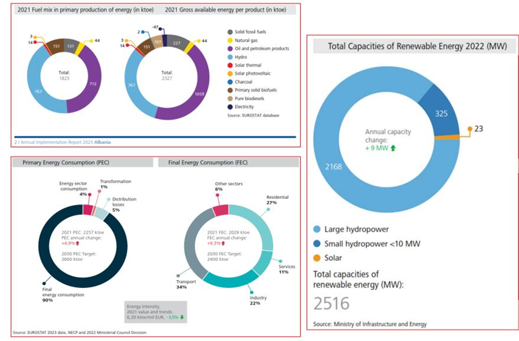 Siç ilustrohet në grafikët, në vitin 2022, Shqipëria ka arritur një pjesë prej 43% të energjisë së rinovueshme në konsumin total të energjisë, ku energjia e naftës, gazit dhe qymyrit janë pjesë e këtij bilanci. Kjo përqindje vjen nga kombinimi i konsumit te energjisë nga burime të rinoveshme në tre sektorë kryesorë: energjia elektrike (RES-E), ngrohja dhe ftohja (RES-HC), dhe transporti (RES-T).